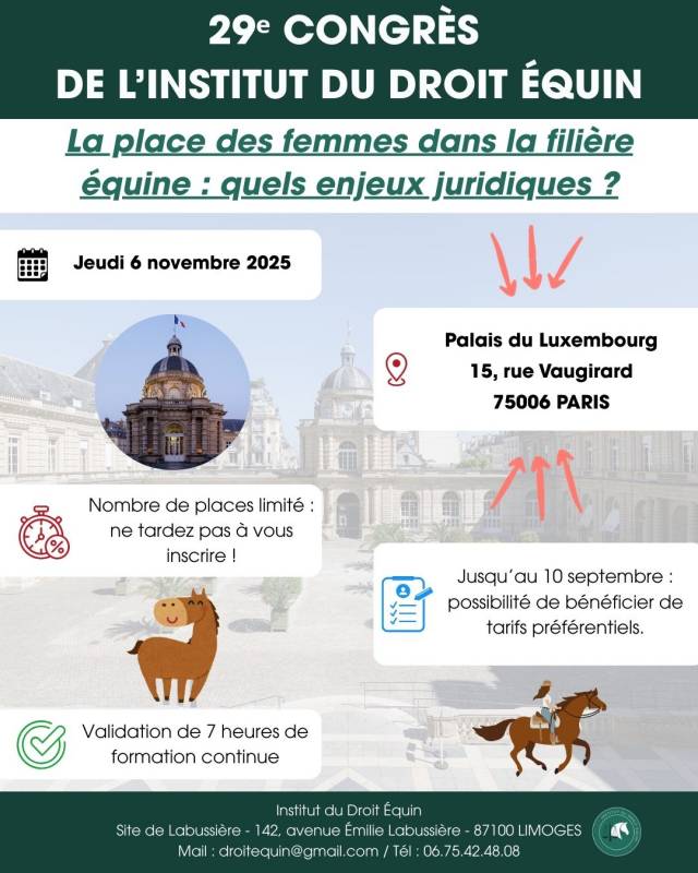 ➡️ Le 29ᵉ Congrès de l'Institut du Droit Équin aura lieu jeudi 6 novembre 2025 au Sénat (Palais du Luxembourg - 15, rue Vaugirard - 75006 PARIS).