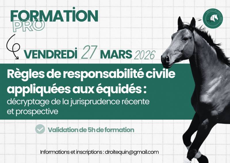 ➡️ Le vendredi 27 mars prochain, l'IDE propose une formation sur les règles de responsabilité civile appliquées aux équidés : décryptage de la jurisprudence récente et prospective.